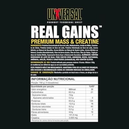 Hipercalórico Completo com Creatina – Real Gains combina proteínas de alto valor biológico, carboidratos complexos, gorduras saudáveis e creatina monohidratada,