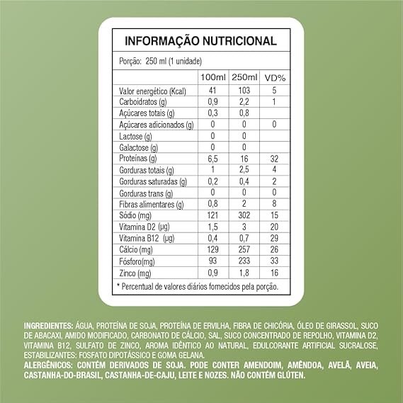 | Ingredientes | Ingredientes: Água, Proteína de soja, Proteína de ervilha, Fibra de chicória, Suco concentrado de abacaxi, Amido modificado, Café solúvel em pó, Óleo de girassol, Carbonato de cálcio, Sal, Suco concentrado de repolho, Vitamina D2, Vitamina B12, Aroma idêntico ao natural, Edulcorante artificial sucralose, Estabilizantes: goma gelana e fosfato dipotássico. |
