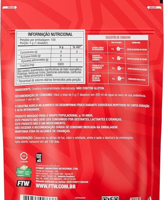 FTW Creatina Monohidratada 100% Pura – Explosão de Energia, Força e Resistência – Absorção Rápida para Ganho de Massa e Performance (Refil 500G)