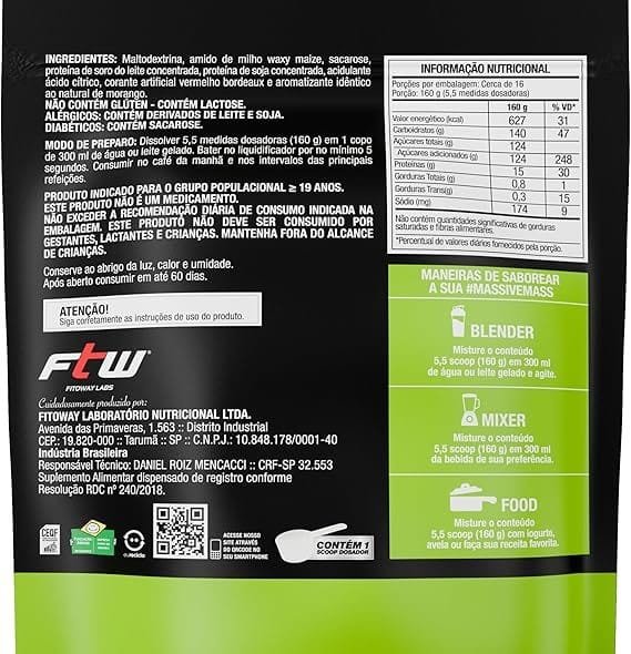 FTW Diabo Verde Massive Mass Hipercalórico com Carboidratos de Rápida Absorção e Proteínas, Suplemento Alimentar Pós-Treino em Pó, Alta Carga Energética, Sem Glúten – Refil 2,5kg (Sabor Morango)