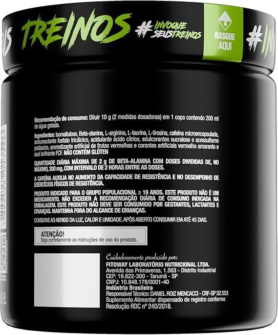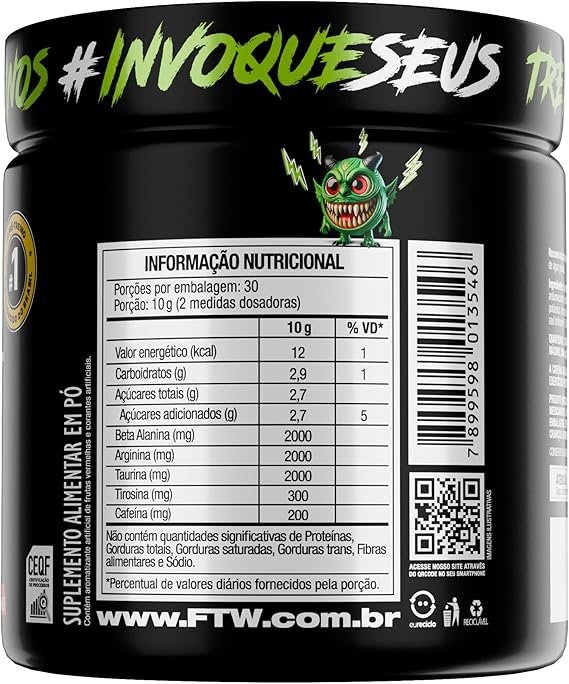 Desperte seu potencial máximo com Diabo Verde #Pre-Workout da FTW, um suplemento alimentar formulado especialmente para quem busca mais energia, foco e desempenho durante os treinos. Sua fórmula combina aminoácidos essenciais com cafeína microencapsulada, proporcionando estímulo de forma gradual e duradoura. Ideal para ser consumido antes das atividades físicas, esse pré-treino é indicado para atletas e praticantes de atividades intensas, sempre com orientação de um profissional habilitado. BENEFÍCIOS: 💪 Fórmula Energizante: Com cafeína microencapsulada para liberação gradual, ideal para manter o foco e a disposição. ⚡ Aminoácidos de Alta Qualidade: Contém beta-alanina, L-arginina, L-taurina e L-tirosina. 🧪 Isomaltulose: Carboidrato de baixo índice glicêmico que auxilia no fornecimento de energia sustentada. 🔁 Rendimento Inteligente: Pote com 300g rende aproximadamente 30 porções. ✅ Sem Glúten: Seguro para quem possui restrições alimentares. COMO CONSUMIR: Dilua 2 medidas dosadoras (10g) em 200ml de água gelada e consuma 30 minutos antes do treino. A dose diária máxima de beta-alanina é de 2g, podendo ser fracionada com no mínimo 2 horas entre as porções. INFORMAÇÕES IMPORTANTES: Produto indicado para adultos (≥ 19 anos). Não deve ser consumido por gestantes, lactantes ou crianças. Este produto não é um medicamento. Conserve em local seco, fresco e protegido da luz. Após aberto, consumir em até 45 dias. Não exceda a recomendação diária indicada na embalagem. Mantenha fora do alcance de crianças.