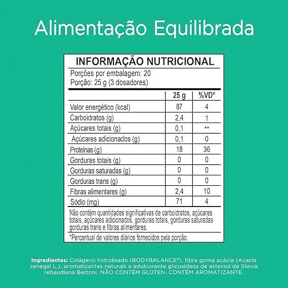 Colágeno hidrolisado (BODYBALANCE®), fibra goma acácia (Acacia senegal L.), aromatizantes naturais e edulcorante glicosídeos de esteviol de Stevia rebaudiana Berton