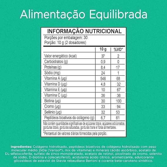 : Colágeno hidrolisado, colágeno hidrolisado bioativo (Verisol®), mix de vitaminas e minerais [vitamina C (ácido ascórbico), vitamina E (DL alfa-acetato de tocoferol), zinco (sulfato de zinco mono-hidratado), vitamina A (acetato de retinol), cromo (picolinato de cromo), selênio (selenito de sódio), vitamina H (biotina) e vitamina D (colecalciferol)], acidulante ácido cítrico, aroma sintético idêntico ao natural, edulcorante estévia e corante betacaroteno