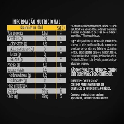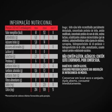 Leite parcialmente desnatado, concentrado proteico de leite em pó, amido modificado, concentrado proteico de soro de leite em pó, enzima lactase, estabilizantes celulose microcristalina, carboximetilcelulose, carragena, fosfato dipotássico e fosfato dissódico, aromatizantes, corante natural carmim e edulcorante sucralose. ÃO CONTÉM GLÚTEN. ALÉRGICOS: CONTÉM LEITE E DERIVADOS. PODE CONTER SOJA. DIABÉTICOS: CONTÉM GLICOSE. CONSUMIR PREFERENCIALMENTE SOB A RECOMENDAÇÃO DE NUTRICIONISTA OU MÉDICO