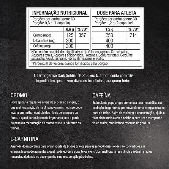 • 【MAIS ENERGIA E FOCO PARA SEU TREINO】 Além de acelerar o metabolismo, o Dark Soldier ajuda a proporcionar maior sensação de saciedade. Também oferece mais disposição e melhora a concentração, favorecendo um melhor desempenho e recuperação muscular.