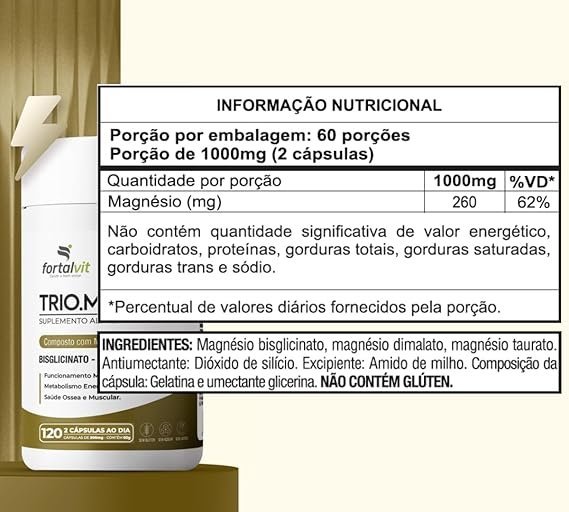 TRIO.MAGNÉSIO – Longa Duração 2 Meses de Uso, Bisglicinato – Dimalato – Taurato, 260mg Alta Concentração,120 Cápsulas, Fortalvit
