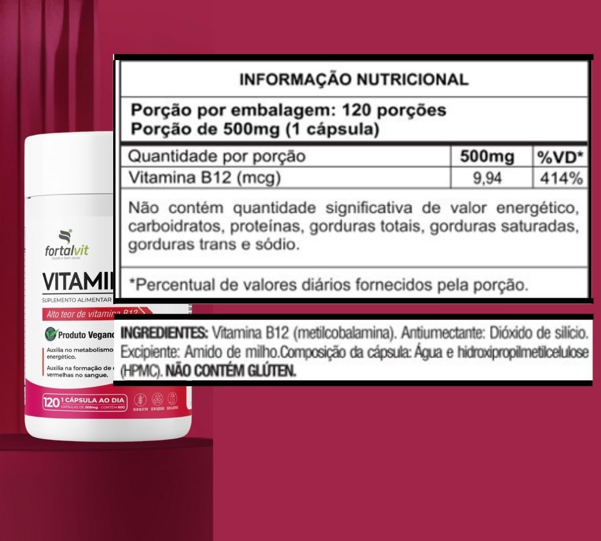 • Suplemento Vegano: As cápsulas de Vitamina B12 da Fortalvit são 100% veganas, perfeitas para quem segue uma dieta livre de produtos de origem animal.